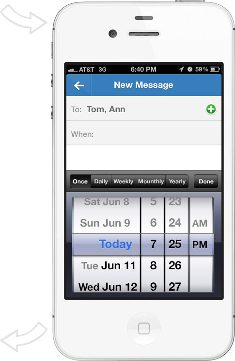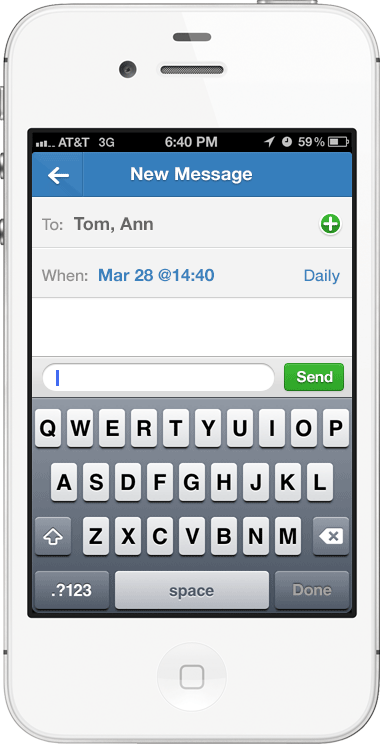 Simply type your message and tap the send button. It's that easy! Your message will now be automatically sent on the time and date you scheduled.Never forget to send an important text